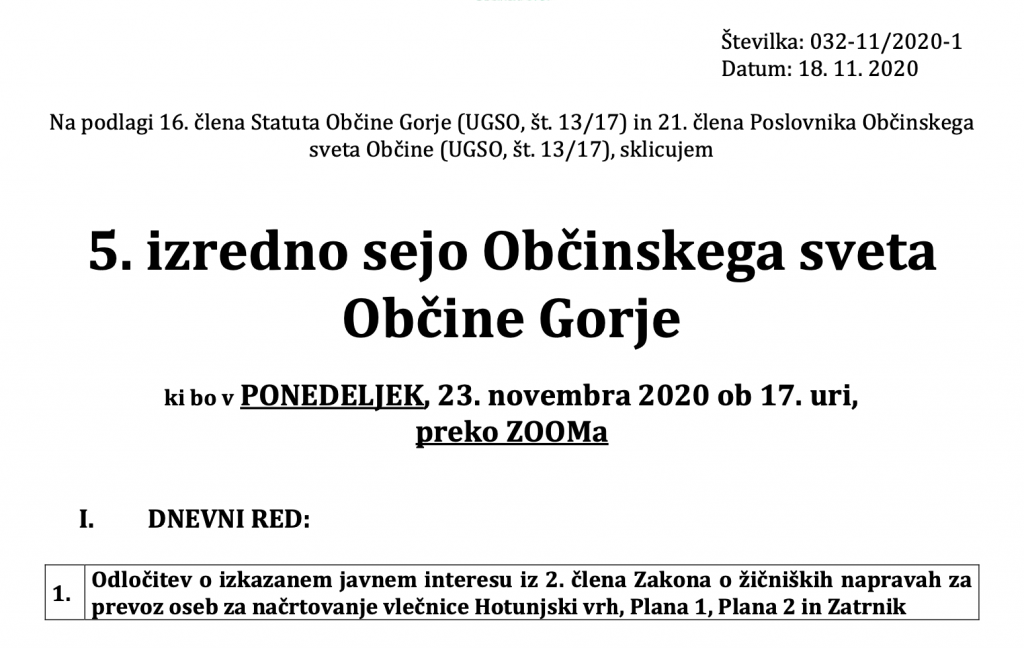Po 11. redni seji, ki je potekala v sredo 11.11.2020 sta bili ekspresno, zgolj v nekaj dnevih po tej redni seji sklicani kar dve izredni, in sicer 4. izredna seja, ki bo potekala v četrtek 19.11.2020 ob 16.uri in še 5. izredna, ki bo potekala v ponedeljek 23.11.2020 ob 17. uri. Svetniki so na 11. redni seji izglasovali, da se odločanje o izkazanem javnem interesu prestavi na naslednjo sejo, ki naj bi bila čez en mesec. Danes pa presenečenje. Župan je 18. 11. 2020 sklical sejo z vsebino o izkazanem javnem interesu po vlečnicah že za ta ponedeljek.