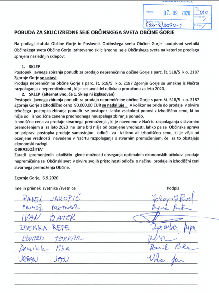 V omenjeni zadevi, zaradi katere je zdaj sklicana izredna seja je župan občine Gorje Peter Torkar 27. 8. 2020 na spletni strani občine in v občinskem glasilu Gorjanc objavil naznanilo o javnem zbiranju ponudb za prodajo nepremičnine občine Gorje, parc. št. 518/5, k.o. 2187 Zgornje Gorje. Zapisana ponudbena vrednost je 90.000 € (brez DDV).