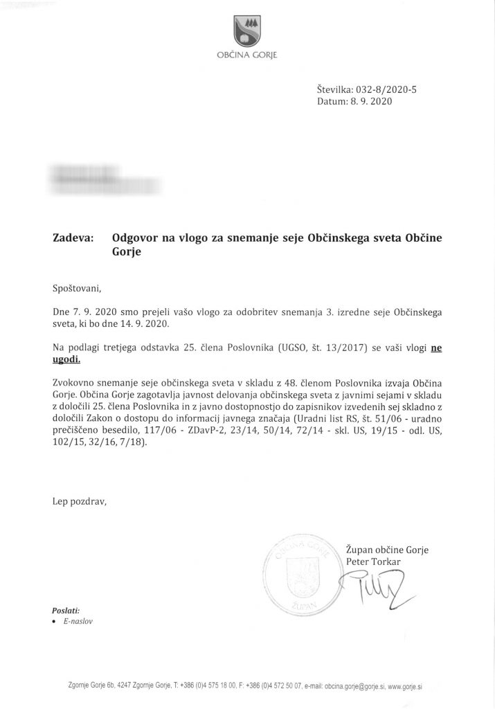 Iz Občine Gorje je bil poslan negativen odgovor na pravočasno poslano prošnjo za snemanje današnje 3. izredne seje, ki bo potekala v Gorjanskem domu ob 16.00.