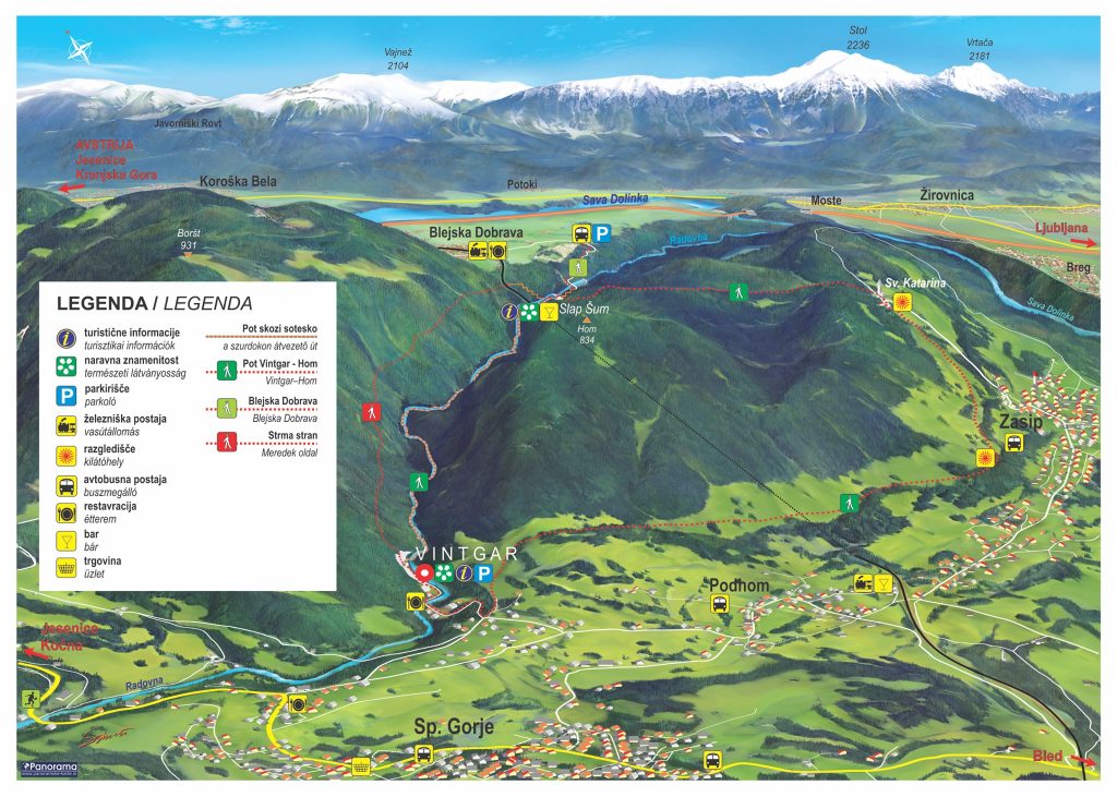 Pot pričnete pri glavnem vhodu v sotesko Vintgar na zahodni strani. Na koncu soteske kjer se nahaja slap Šum, pod slapom je razgledna ploščad od tu lahko nadaljujete pot naravnost po makadamski cesti skozi gozd, ki se rahlo vzpenja. Po dobrih 20 minutah hoje boste prispeli na parkirišče pod pokopališčem na Blejski Dobravi. Okrepčate se lahko v baru oziroma v bližnjem gostišču. Sledite asfaltirani cesti proti jedru vasi s cerkvijo Sv. Štefana. Pri cerkvi je obnovljeno vaško jedro s spomenikom čebeli. Od vaškega jedra sledite cesti levo navzgor. Na vrhu hriba pri vodnjaku ponovno zavijete levo. Cesta vas bo vodila mimo hiš do konca naselja in gozdne poti, ki vas bo pripeljala nazaj do brunarice ob vhodu v sotesko. To pot po domače imenujemo »Strma stran«, saj se del poti na vrhu klifov vije prav nad sotesko. Na poti bodite previdni in ne stopajte preblizu roba. Ne prožite kamenja, kajti pod vami so obiskovalci soteske.