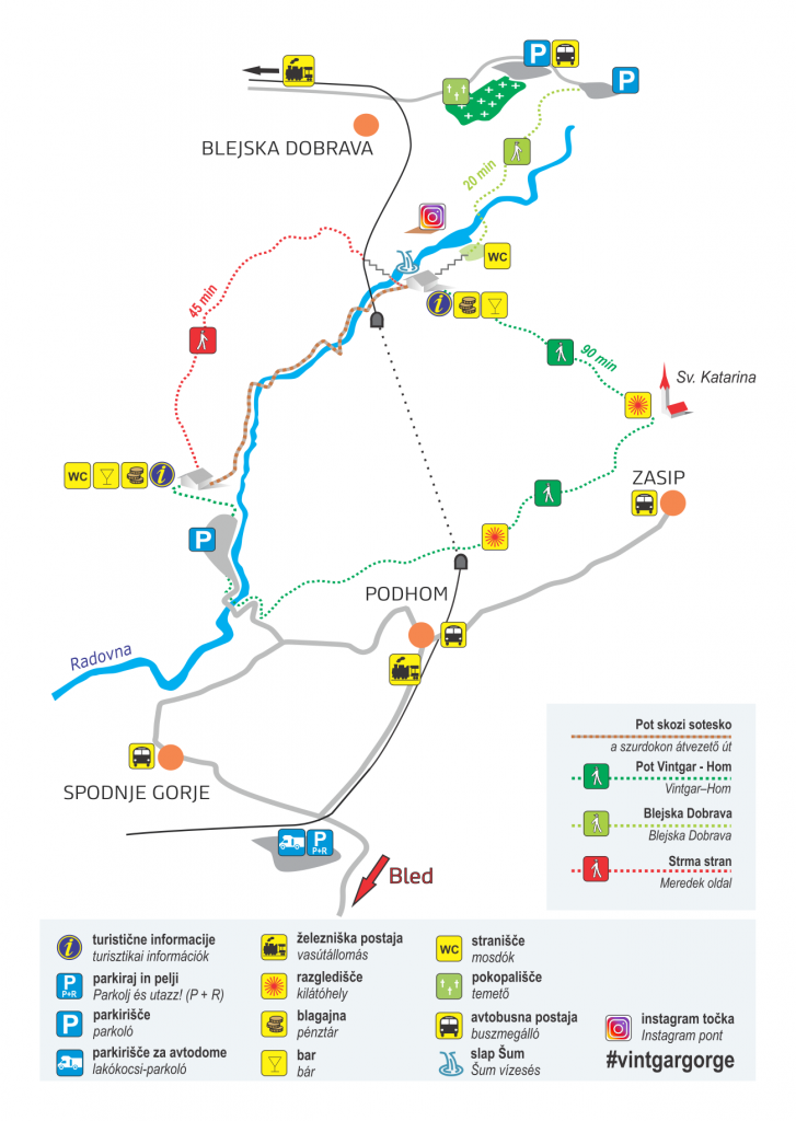 Ločili smo vstopno in izstopno točko. Možnosti povratka skozi sotesko ne bo. Tako bomo preprečili srečevanje na ozkih delih poti. Vstop bo pri brunarici v vasi Podhom, izstop pri slapu Šum na Blejski Dobravi.
